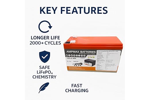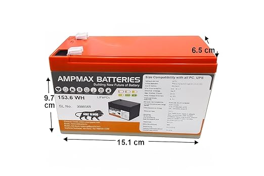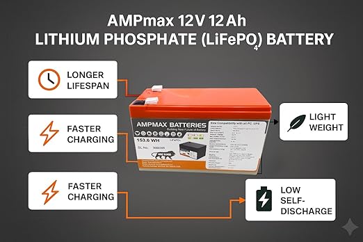 Ampmax 12V 12Ah Lithium Phosphate (LiFePO₄) Battery – Long Life Rechargeable Battery for Computer UPS, Inverter, and Backup Power